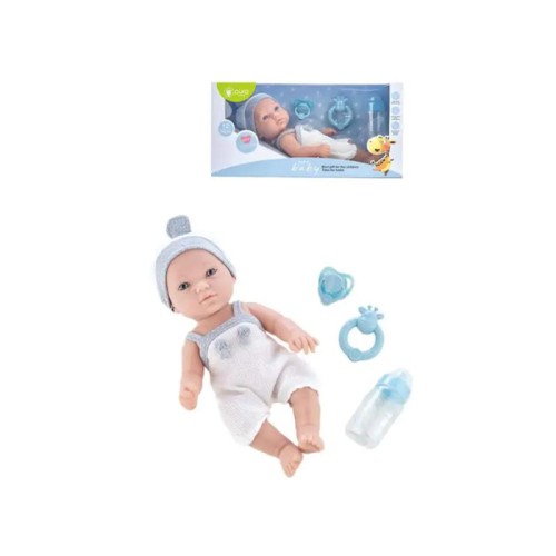 | Karakteristike | U setu: 1x lutka beba, 1x letnji bodi, 1x kapica, 1x duda, 1x zvečka, 1x bočica Materijal: vinil/plastika Veličina lutke: 30 cm |