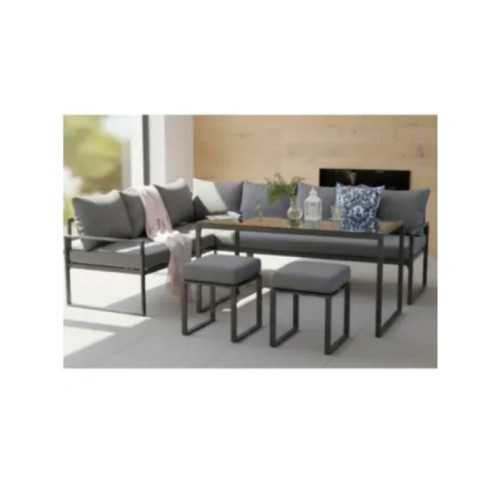 | Karakteristike | Moderan i minimalistički dizajn. Ugaona baštenska garnitura za optimalno korišćenje prostora. Pogodna i za opušteno sedenje i za obedovanje.. Stabilna čelična konstrukcija otporna na svakodnevnu upotrebu Sto sa čvrstom staklenom pločom debljine 5 mm i svilenim printom. Udobna sedišta sa jastucima debljine 10 cm. Kvalitetna spun poliester tkanina (220 g) prijatna za sedenje. Dva praktična taburea kao dodatna mesta za sedenje ili oslonac za noge. Jednostavno uklapanje u različite eksterijere. Idealna za terase, bašte i zatvorene prostorije. |