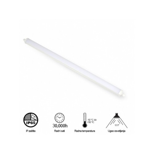 | Karakteristike | Nazivni napon: 220-240V AC / 50/60Hz Nazivna snaga: 50 W Temperatura boje svetlosti: 6500 K Boja svetla: CW (hladno bela) Svetlosni fluks: 5000 lm Izvor svetlosti: LED Dimabilnost: Ne Materijal: PC Dužina: 1500 mm Tip montaže: Nadgradna Temperatura okruženja (ºC): -10 °C do +50 °C Prosečan radni vek: 45 000 h Broj uključenja/ Isključenja: 15 000 Energetska efikasnost: A+ Stepen električne zaštite: Klasa II IP zaštita: IP 65 PotrošnjaeElek. energije: 50 kWh / 1000h |
