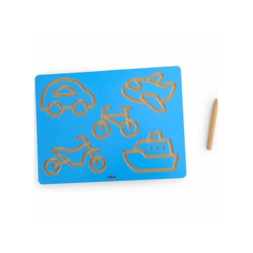 | Karakteristike | Viga grafomotorna tabla za vežbanje crtanja vozila pomoću drvene olovke. Set uključuje tablu i olovku, a cilj igre je da pomeranjem olovke po otvoru table čime deca simuliraju crtanje vozila: auto, avion, bicikl, motor i brod. Dimenzije: 30 x 22,5 x 0,9 cm |